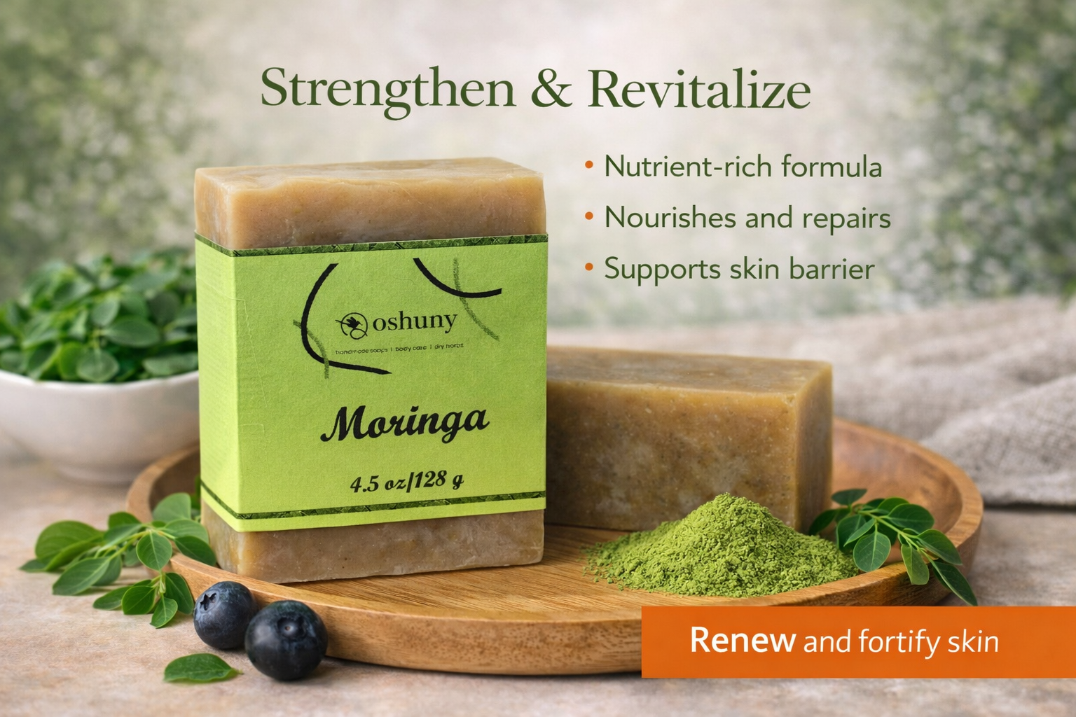 A moringa soap designed to strengthen, nourish, and refresh the skin barrier.