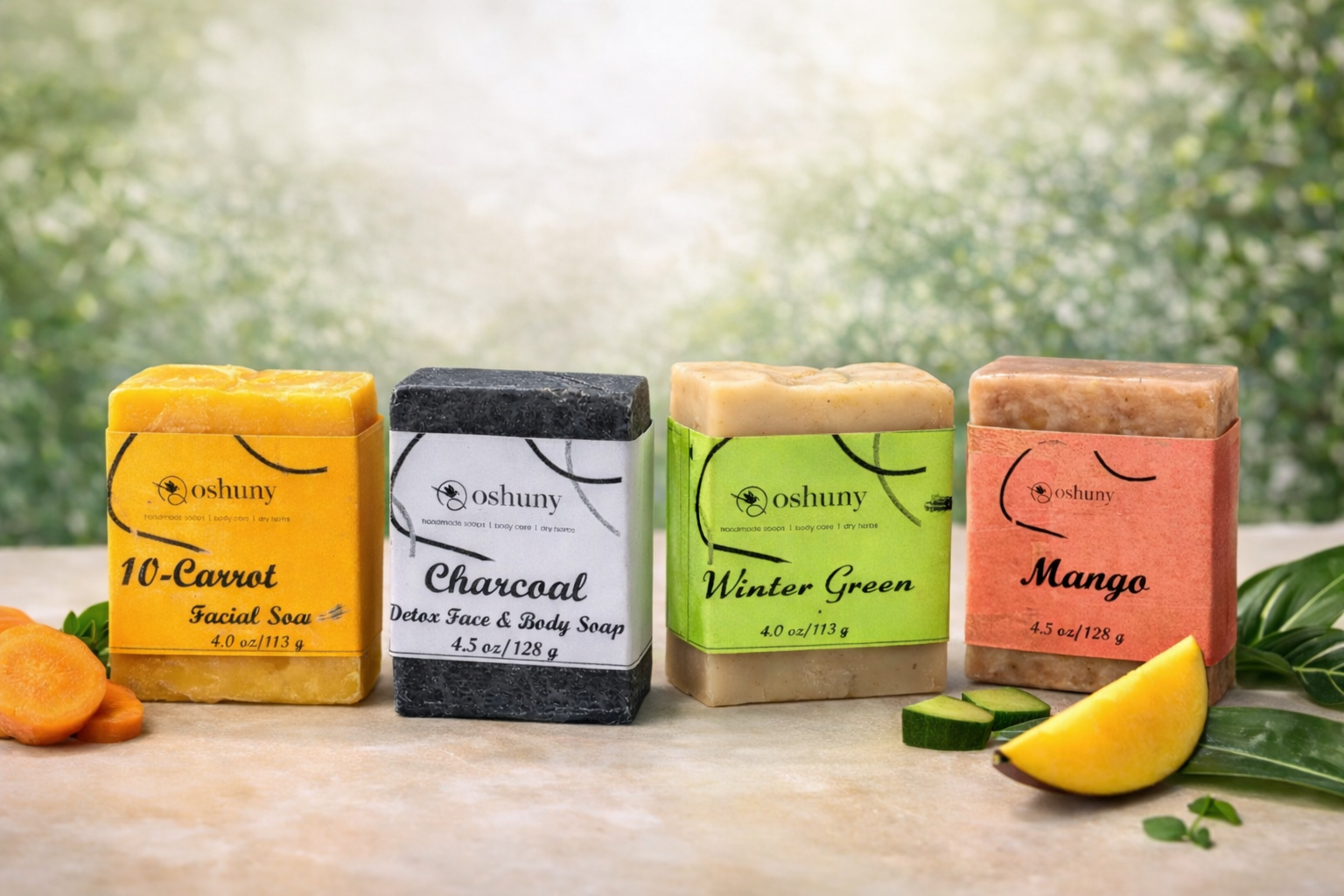 Winter Green + Coffee Fusion + Charcoal + Mango soaps selected for a soothing cleansing routine.